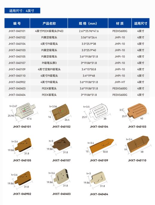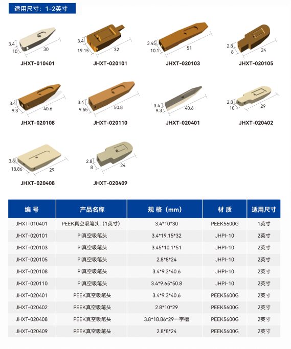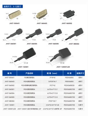 PEEK真空吸筆頭及吸筆桿 使用范圍:用于2-8英寸半導(dǎo)體晶圓片或者LED外延片組件形式:直插式/螺紋式 特性優(yōu)點(diǎn): 瞬間耐溫320℃,持續(xù)耐溫250℃ 真空無痕吸附 純度高,不含有鹵族元素,對(duì)半導(dǎo)體材料無污染 耐化學(xué)性腐蝕 高強(qiáng)度、耐磨損 可以升級(jí)為防靜電PEEK制作